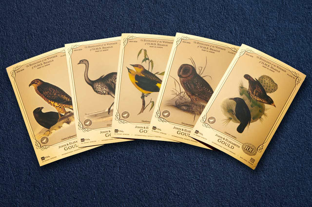This collection includes the lithograph artwork of the Cactus Finch, Darwin’s Rhea, Galapagos Hawk, Saffron Blackbird, and the Tawny Owl.